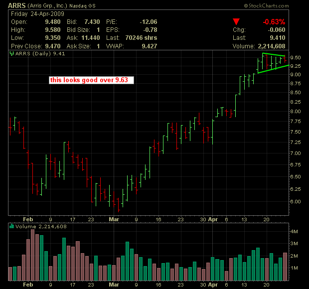 The financials are fascinating in here and there are so many questions. Is all the bad news in these names? If so, aren’t they overextended in a big way? Is USB really worth $19 up from$8? STI $16 up from $6? WFC $21 up from $8. You get the picture. They came down hard so I’m not surprised that they are are catching vicious short squeezes in here, but valuation at some point has to become an issue doesn’t it? Not in bear market rallies it doesn’t, so although I think this sector is still “Death”, I will respect the trend for the time being. Futures are currently down about 100 points on Dow Jones, but that could be some early uneasiness from the Swine FluPandemic that is gathering some steam. May 4th is the date when we hear the real deal from Geithner on the banks so be prepared for a very whippy market between now and then.
