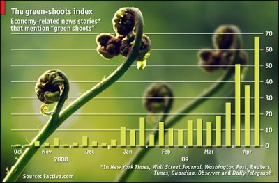 And he winner of the 2009 buzzword for recovery is…..green-shoots. This has quickly surpassed “mustard seeds” and phrases like “we are in a bottoming process” and “everything will be cool in six to twelve months.” CNBC is scurrying frantically as they make sure they are saying the word at least six hundred times a day as failure to meet this quota could result in a major correction. The producers at CNBC are also desperately searching through their rollodexs to summon the same incompetent perma -bulls that have been wrong for the last 8000 points and will now tell us how to play the “new bull market.”