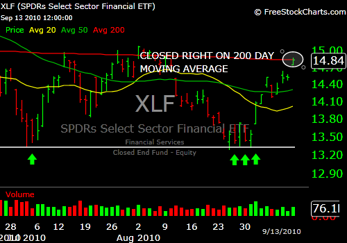 OK, I’ve talked about the financials for two years, since I started the blog, but lately have beaten to death my concept of “banks in the box”. For you newer folks, that is the phrase I use to describe the range that the XLF has been in from early May to present, and all the gyrations in between. It is basically the range between $13.34 on the downside to about $15.09 to the upside. Today the XLF closed exactly at the 200 day moving average….exactly. On 8/2/10 it traded as high as 15.09. but closed at 15.08. A close above that high level would be bullish, but it will need to hold.