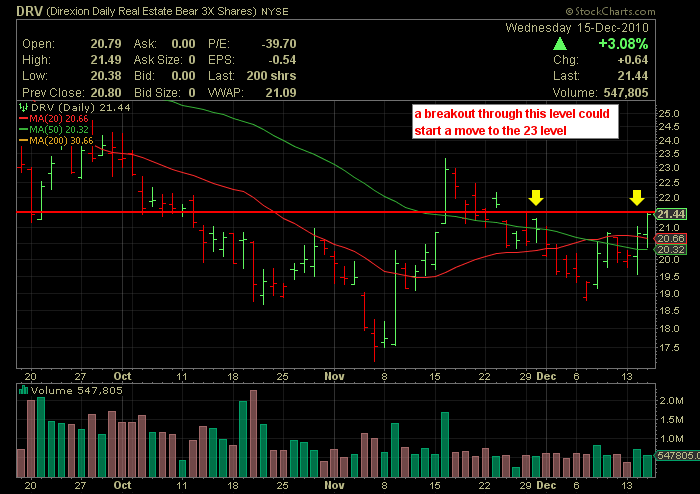 Some momentum names continued to roll over a bit today, so lets stay light on out feet. We will see lighter trading starting tomorrow, probably until the second week of January. I am adding DRV long this evening (TRIPLE SHORT COMMERCIAL REIT). I eyeballed it at the open this morning and wish I had added it earlier. If you take a look at IYR, it’s having trouble and may be cracking. The two big components of IYR (SPG & VNO ) are also rolling over. I would buy it around the 21.50 level, but don’t chase at the open as you should let it settle.