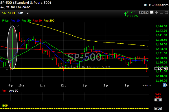 There is your five minute chart of the S&P today. All the action was in the first five minutes. We sold off hard, held the opening level tried another bounce, and then went lower near the close. Bottom line? A fairly choppy day, unless you were long over the weekend and sold the opening.