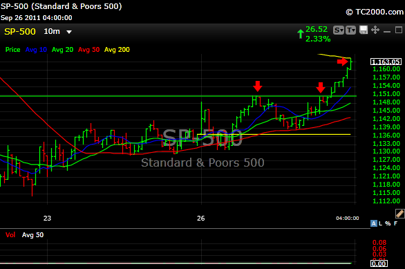 The above chart (click to enlarge) is the 10 minute chart of the SPX today. Today on our the chat room, as things were starting to act up, I mentioned that there was some resistance at the 1150-1152 level and that if the index managed to break through that level, it could tag the 1163 level. Well, it did break through (2 red arrows) and guess where it landed? Right around 1163. See the upper right of the chart, that little yellow lines happens to be 200 period resistance and that is where it stopped. That’s all fine and good, but it was a stealth rally that kind of snuck up on you. The DOW and the big caps led, while the Russell and Nasdaq lagged. It was only until later in the rally that those indices jumped in the sandbox to play with the other kids. I don’t like first day rallies after a big sell off, so I really didn’t participate. It’s the second and third days (follow through days) that validate the first move. Then I get interested. Short squeezes can be violent and magnificent in bear markets. All of the sectors that I have been writing about got bounces today. XLB, XLE, XLF, XME, XLK and others all popped. Let’s hope this can be the start of a solid rally, but so much (if not everything) depends on Europe, so we really aren’t in control at this point. We’ve all seen this movie before so be careful out there. One day day does not a trend change make. Have a great night and I’d like to extend a warm welcome to all the new subscribers.