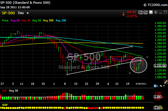 Our wedgy is breaking again. Yesterday’s rally got the SPX above the bottom of the trend line, but the rally pooped out and it couldn’t close above it. Today we fell apart at the seams and closed on the lows going away. Horrible action, very bearish action. I received a few emails the other day asking me why I haven’t been long in a big way the last couple of days. This is why. Bear market rallies look good for a couple of days, but that’s all they are, bear market rallies.