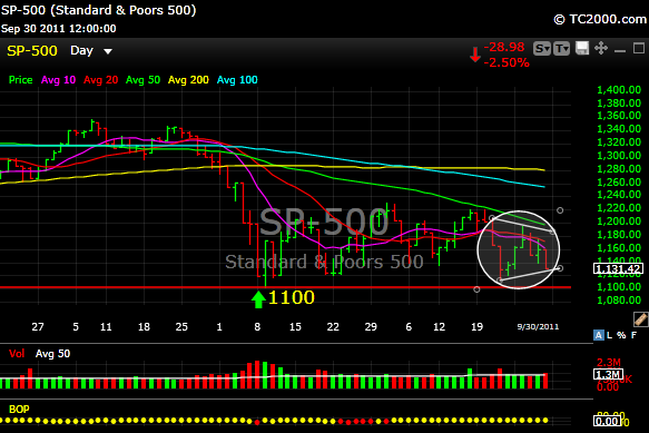 I haven’t a clue what Monday will bring. Back in the day when stocks closed violently on the lows, the next morning we would most likely follow through lower at the open. We now find ourselves in such a headline market, so anything can happen from a piece of news. The last quarter of the year is historically good for the market. That doesn’t mean we cant knock out 1100 and kiss 1040 which I think is a distinct possibility before we get happy feet again. Nothing goes straight down and there will mind blowing rallies along the way.