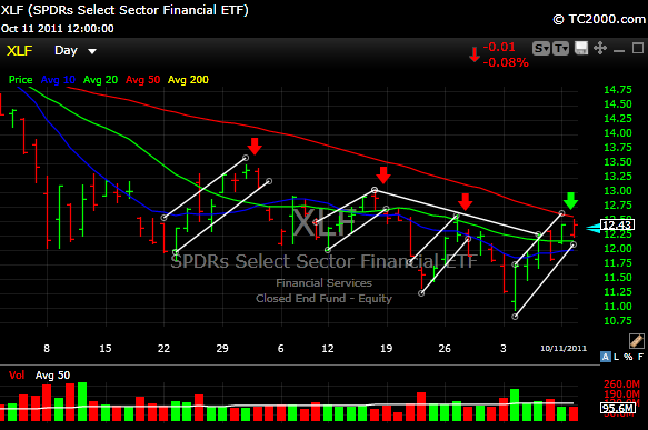 The financials are in day six of their uptrend. In this morning’s blog post I mentioned some resistance level. The 50 day moving average is 12.57 and as you can see the $XLF came within four pennies of that number before it was rejected.