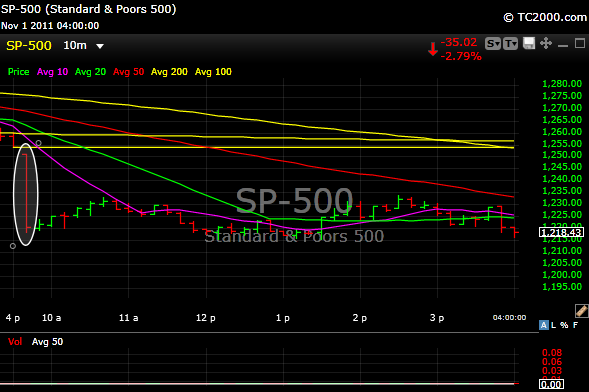 When we have stops and the market gaps down through those stops (it happens sometimes and it has been happening more because of this headline market) you have a decision to make. You can take the stop right at the open or let it trade for a while.