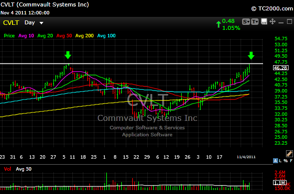I put $CVLT on my long swing list for subscribers on Wednesday at 44.58. The stock came within pennies of all time highs today in an ugly tape and has a good earnings report behind it and may want higher levels. It may need to trade sideways for a few days before higher further price improvement. Watch the 47.56 level for a breakout.