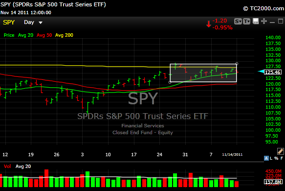 The yellow line is the 200 day moving average and that needs to be eclipsed with some actual volume. Although the market was down today, I believe it was down on the lowest volume of the the year. Buying opportunity or shorting opportunity? Not so sure, so we have little of both. I think we will get some closure this week.