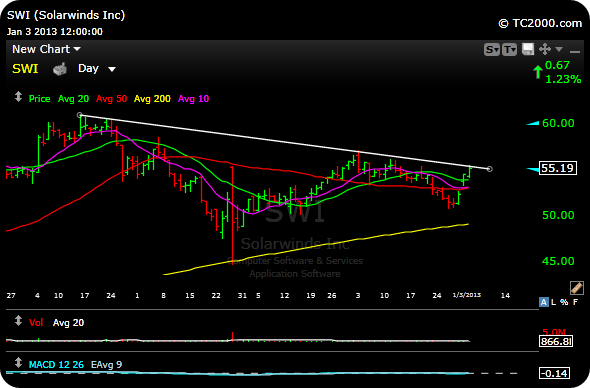 I also have one new long set up tonight: SWI. As you can see below, the stock kissed the underside of that white downtrend line today. If it can push through it with some volume, it could get going nicely to the upside. I would buy it around 55.75