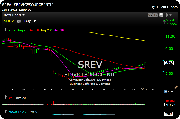 SREV used to be a $ 25 number back in 2011. Something must have gone horribly wrong, but it’s probably safe to say that all the sellers were shaken out. The stock has recently broken above its 10,20 and 50 day moving averages and it looks like it is being accumulated as volumes are increasing. I would get long around the 6-85-6.90 level.