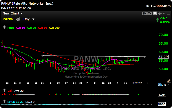 PANW– This one has only been a public company for about six months, but volume is picking up (showing accumulation) and may be ready for a big breakout. Buy the 57.65 level for the breakout.