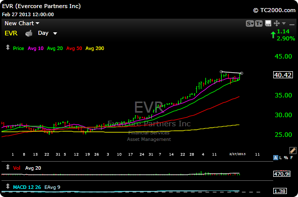 EVR– This stock has barely traded below the 20 day moving average in a long time. Like many stocks it’s slightly extended, but has been consolidating for a week or two and the volume is good. I would play this one as a breakout play at the around the 40.82 area.