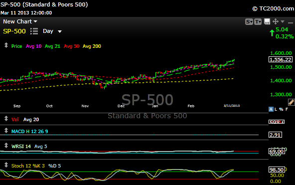 Well, we clawed closer to the all time S&P high today. The countdown is now about 20 S&P points. Since the year started the S&P is up about 130 points and the DOW is up about 1.300 points. Amazing. Many feel we are overbought, the technicals also confirm that.