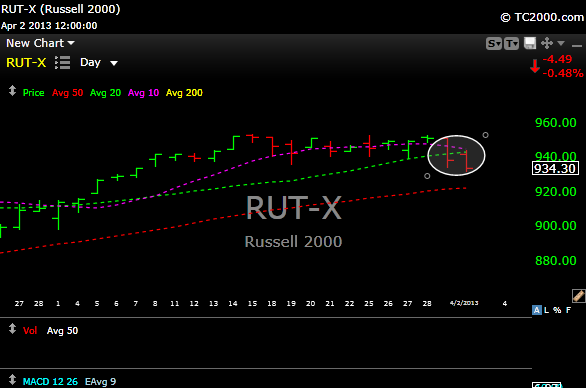 {+++} The markets moved higher yet again, averaging anywhere from 1/2 to 3/4%, with the EXCEPTION of the Russell 2000. The Russell (IWM) showed a crack in the armor yesterday, and it followed through lower again today. The Russell has been on a massive drive higher and it tagged historic highs this year. We’ll see if this small correction (Russell) is the start of something bigger or if it will carry over to the rest of the indexes or not, but you should keep a close eye on how it trades in the coming days. 50 day moving average support is just below the close today.