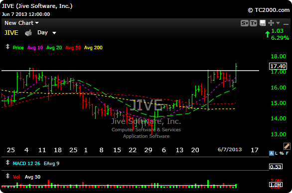 $JIVE– I put this one on Stocktwits stream minutes before the breakout on Friday. Looks like it s breaking out of a cup and handle base. Over Friday’s high it’s good for more.