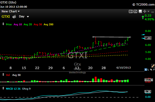 GTXI is getting some attention volume wise and the daily MACD started to turn up on Friday. This is either a double top right here or the beginning of a move higher. The volume tells me its probably not a double top though. You can buy this at the 7.00-7.25 level.