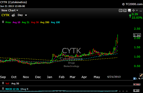 CYTK- This one a little different because this is a buy and put away stock for me. I owned this one earlier in the year at 1.15 and sold it around 1.30. Genius. There was big news on this stock Tuesday as the company announced that results from ATOMIC-AHF have been accepted for presentation during a Hot Line Late Breaking Trials Session at the European Society of Cardiology (ESC) Congress 2013. the stock traded from 1.40 to a close of 2.16 on Friday.