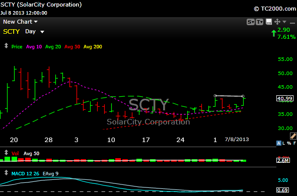 SCTY– I mentioned this one on the chat today but didn’t make it actionable. The solar plays are hot, and although many seem extended, SCTY seems to be consolidating nicely after its recent pullback. The MACD turned positive today and the volume is picking up. Buy the 41.33 level.