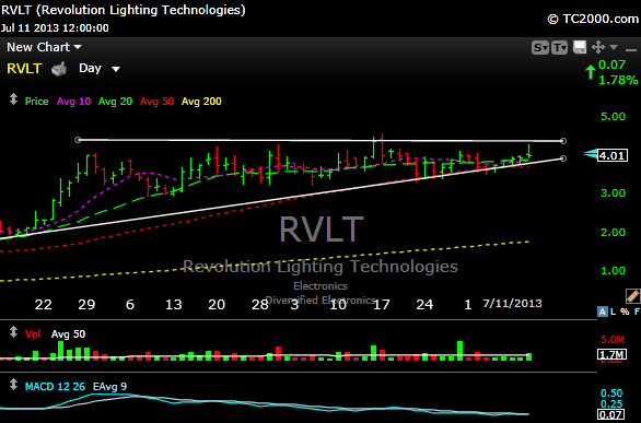 I added RVLT today as a long for a couple of reasons. The chart looks very good and its a way to play the housing stocks should they stay strong.
