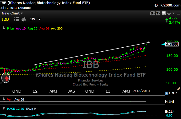 Biotech stocks are on an HGH, epinephrine and crystal meth cocktail right now. The $IBB (iShares Bio ETF has gone from about 85 to a close of 193 over the last 23 months.) In August of 2011, the ETF bounced off its weekly 200 day moving average and has never looked back.