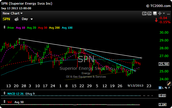 SPN – Broke out of a mini downtrend (light blue line) a little over a week ago. It did so on heavy volume which you like to see. It now seems to be in a bull flag under the more important downtrend line (white line). I would buy between the 26.00-26.50 area.
