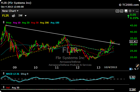 $FLIR is very interesting here. As you can see below, the weekly chart has broken out of a downtrend that started back in 2008. On July 25, the stock exploded above the weekly downtrend line, it continued the next day. On the weekly, you can see that it came back to retest the uptrend line and then bounced higher again. It’s actually a strong bull flag.