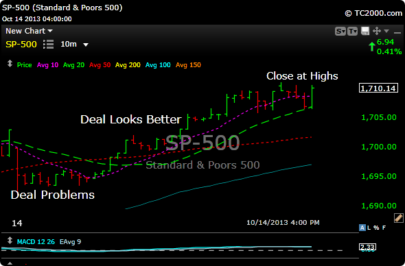 If you think politics doesn’t matter when it comes to the market then think again. We have become eerily reminiscent of Europe not too long ago, when every sudden uptick and down-tick was based on an utterance from Merkel or Sarkozy. They have passed the baton to Reid and Boehner. Only the names have changed. Futures were way lower overnight on Sunday, and that sentiment drifted into yesterday’s open until the rhetoric became more dovish. The chart above is a 10 minute view of the $SPX.