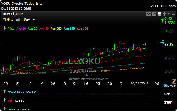 YOKU has been trading in a tight range and may break out soon. Buy the 31.10 level