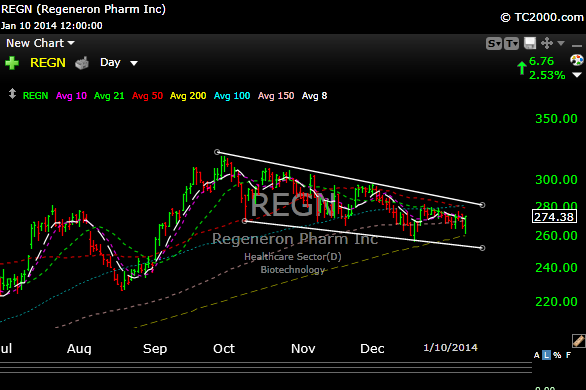 REGN is one of the Cadillac biotechs that we may have s shot to buy here on a pullback. Buy the 274-277 level. These wedges or falling channels have been money in this market, and REGN is in one right now.