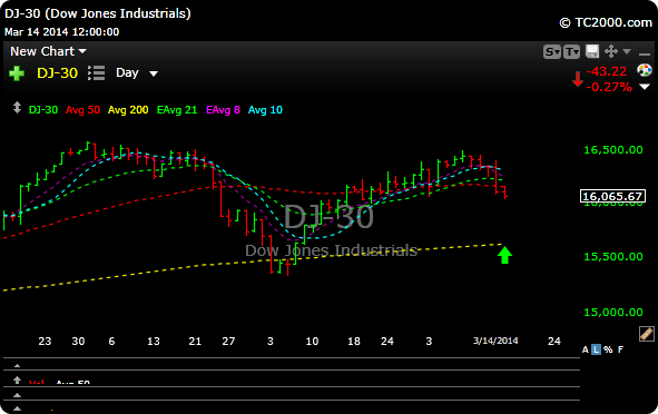 What is interesting and frustrating is that the $SPX, $QQQ and $IWM made highs in January (pulled back in February) and went on to make higher highs in March. Not so much for the Dow. The Dow was not able to participate in those new highs. If the Dow does go back down and test the 200 day moving average (15,619), then that whole V shaped bounce that started in early February was all for naught. Remember that the Dow was the last to catch up to the rally, but now is the first to be rolling over. Granted small caps have been on fire.