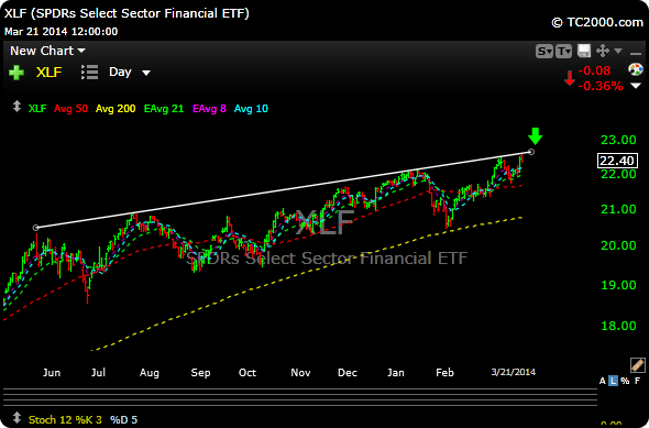 The one group that has the wind at its back now are the financials ($XLF). The groups that don’t, are gold, utilities and biotech. Bond equivalent names need to be sold or shorted. Rates are going up. The XLF is at the top of a long channel. If there is a rotation out of these other sectors and into the banks, then expect a very strong run into year end.