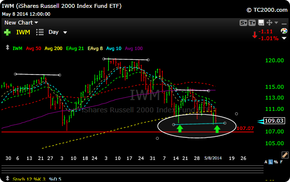 The Nasdaq (QQQ) doesn’t look much better. In the chart below you can see the small red uptrend line in the lower right. if that breaks lower, in my opinion, it will send the QQQ down to lateral support around the 82 level which is also down around 200 day moving average support (yellow line). Keep in mind that the Russell has already broken its 200 day moving average.