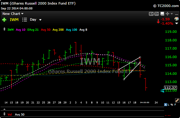 The problem child again is the Russell 2000. As I mentioned in last night video, yje Russell was in a bear flag last week and Friday it put in an ugly bearish engulfing candle. That isn’t bullish, and today it followed through to the downside and closed down another 1.4%.