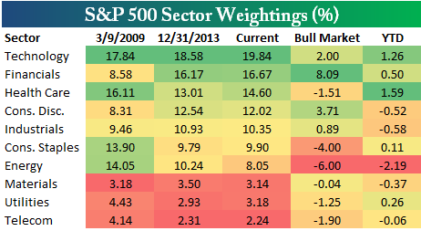 Below is a look at how sector weightings have changed in 2014 and since the bull market began in March 2009.