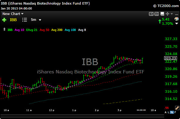 One very positive event today was that the biotech etf, IBB closed at an historic high. Talk about a sector with mojo. Below is a 5 minute chart of today’s action.