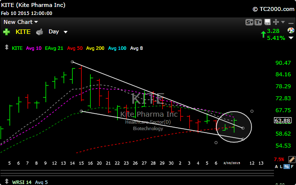 Why KITE?… The stock is in a bullish falling wedge pattern and of you notice, the sell off has been on lighter volume than the 50 day volume average which os what you want to see. It has also done a good job of holding its 50 day moving average for the last 5 trading days.
