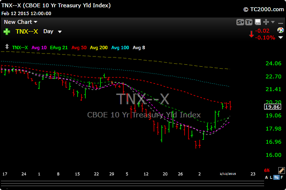 The indexes were marginally green today, but managed to make more highs. The big mover today was interest rates as the 10 year treasury (TNX) was up over 6% to a yield of 2.14. The yield closed at 1.67% just about 2 weeks ago.