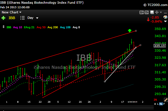 Biotech had a very sloppy day (with the exception of our NDRM) which popped about 10%. Unfortunately ZFGN stopped. As you can see in the chart below, IBB had a pullback day after making all time highs on Monday. However it is still in the bullish channel (red lines) and held its very short term uptrend (white line).
