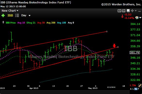 The biotech etf (IBB) once again regained its 50 day moving average, but boy has it been a struggle lately. It still remains under uptrend line (red line).