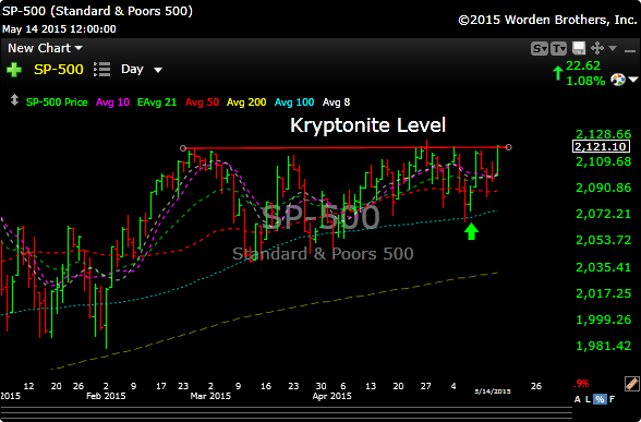 The Russell 2000 had a decent day an closed right t its 50 day moving average. The Dow finds itself very close to new all time highs. What a difference a day makes huh?