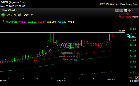 I added AGEN during trading hours today at the 8 level. It backed off from the breakout level, but looks good.