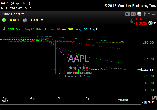 Apple is down $8 in after market trading, so I would expect a sell off in tech and Nasdaq related items in the morning. Its currently trading around 122 and the 200 day moving average is around 120, so look for that spot to act as support.