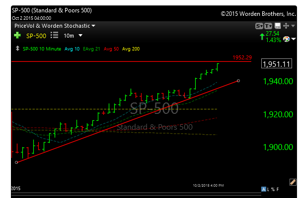 That’s a 10 minute chart of the SPX. We saw an abysmal opening on Friday then the bulls must have reconnoitered under the Buttonwood tree and started buying. A 50 handle rally off the lows was impressive. You have to give credit where credit is due.