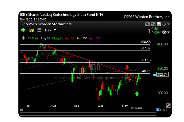 A couple of things get me bullish again on biotech, or “the IBB”. First of all it broke above a downtrend line that has been in place since August (see chart below). That’s a good start but that needs to hold.