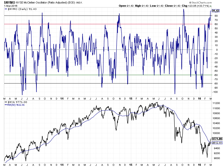 I posted the chart above of the NYSE McClellan Oscillator, I usually post the other one, but as you can see it registered a close at 91 today. If you go back several years on that chart, you can see what happened next. Misery ensued. Is this time different? Will it break higher this time?