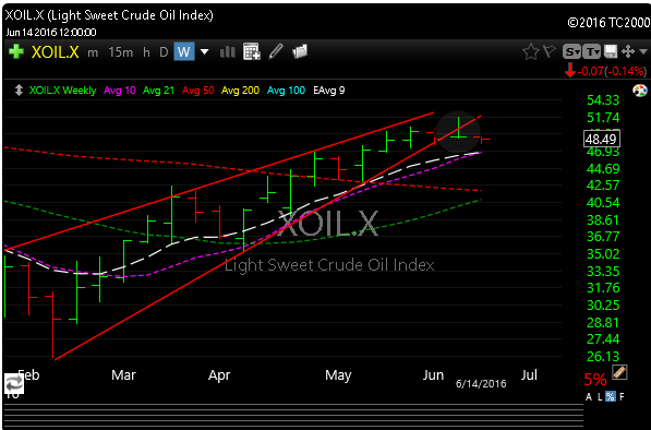 Oil is interesting here, but so much depends on rates and the dollar. Based on that gravestone doji (above, small circle) last week it should go lower. We’ll just have to see. I don’t see a move to 45 being a big deal here based on where its come from. It also broke an uptrend last week that was in place since January.